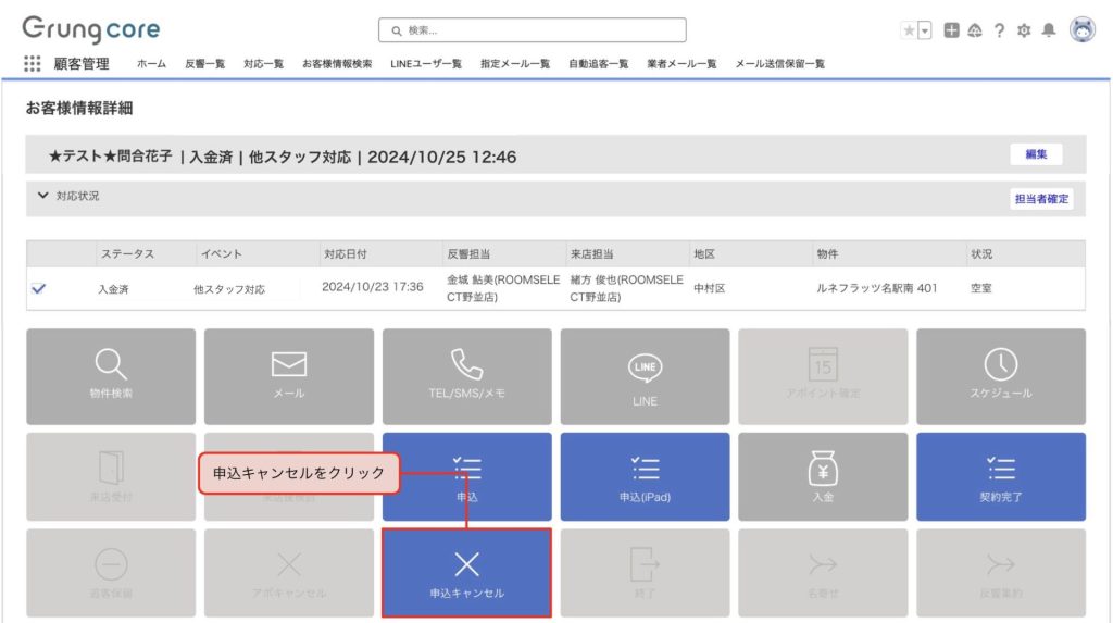 お客様情報詳細の「申込キャンセル」をクリックします。