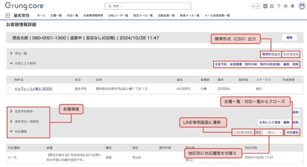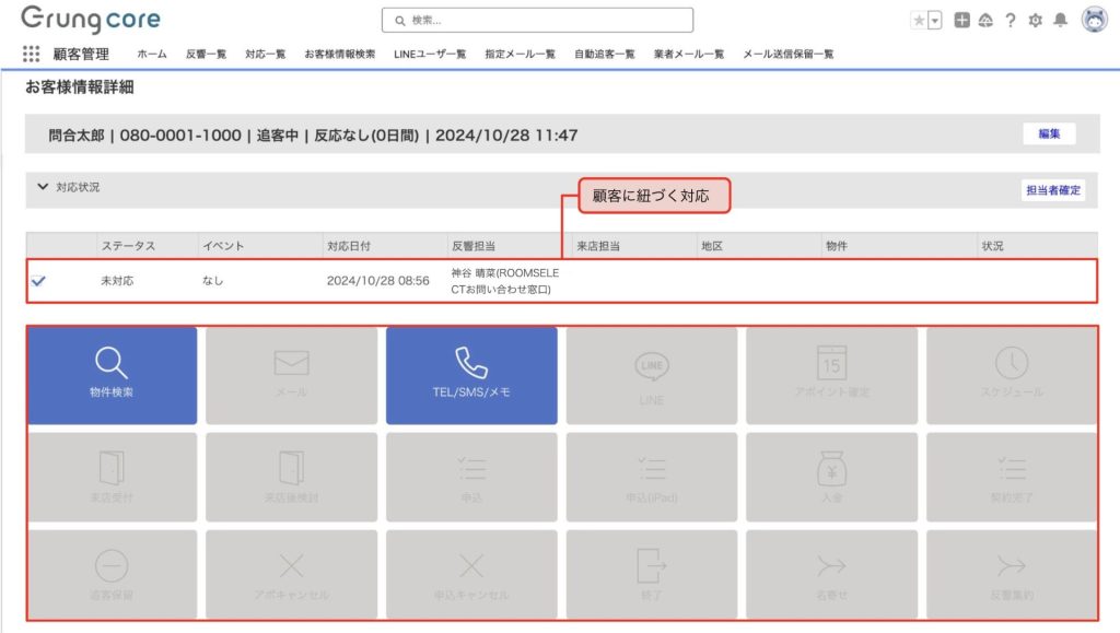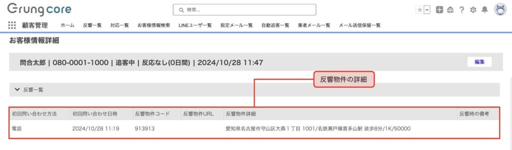 「反響一覧」には反響方法や日時、物件詳細などが反映します。