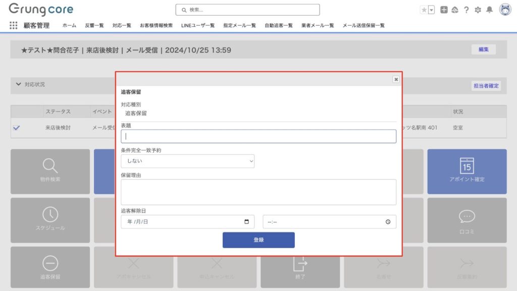 お客様情報登録に保存された条件に、完全一致する物件が「空室」または「退去予定」になった場合、追客保留を解除します。
