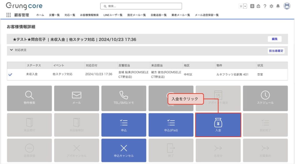 お客様情報詳細の「入金」ボタンをクリックします。
