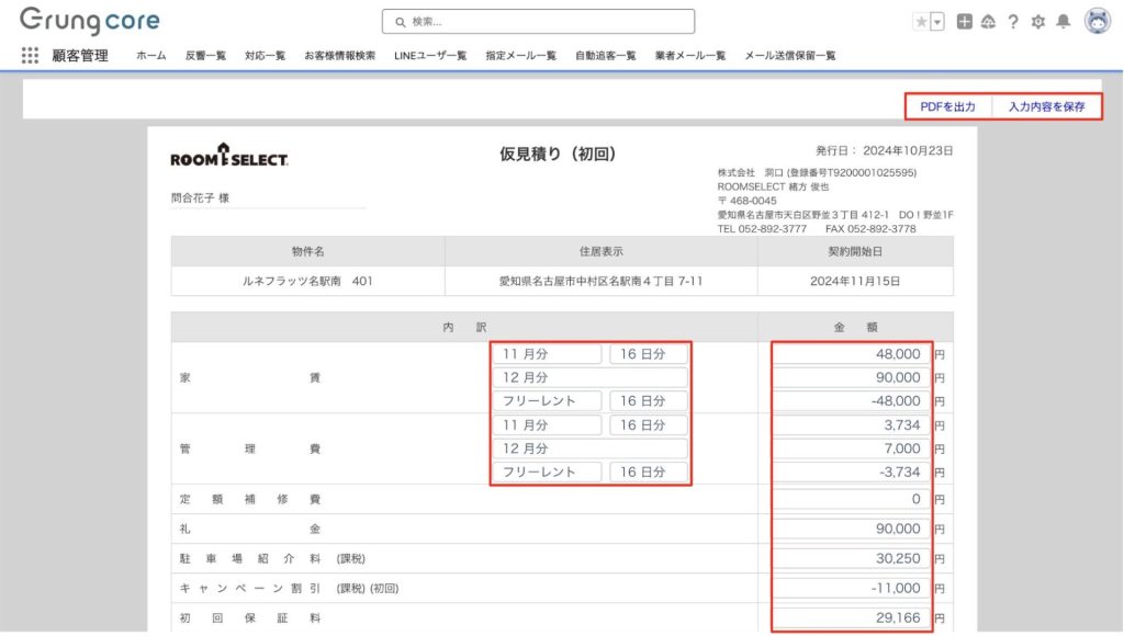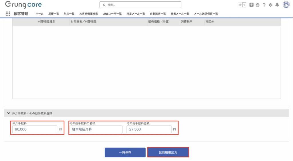 出力計算された仮見積書の「内訳」や「金額」は修正可能です。