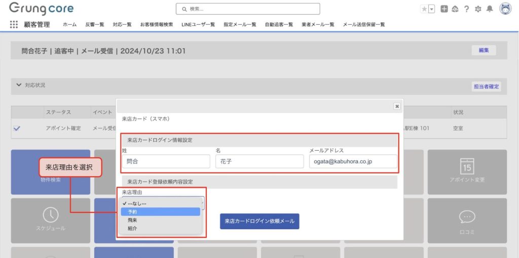 「来店カードログイン情報設定」の確認と「来店理由」を選択して「来店カードログイン依頼メール」ボタンをクリックします。