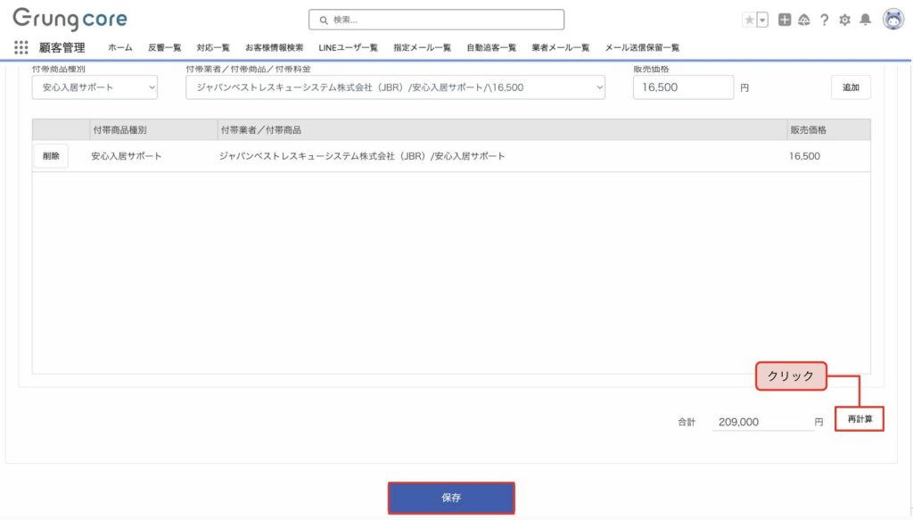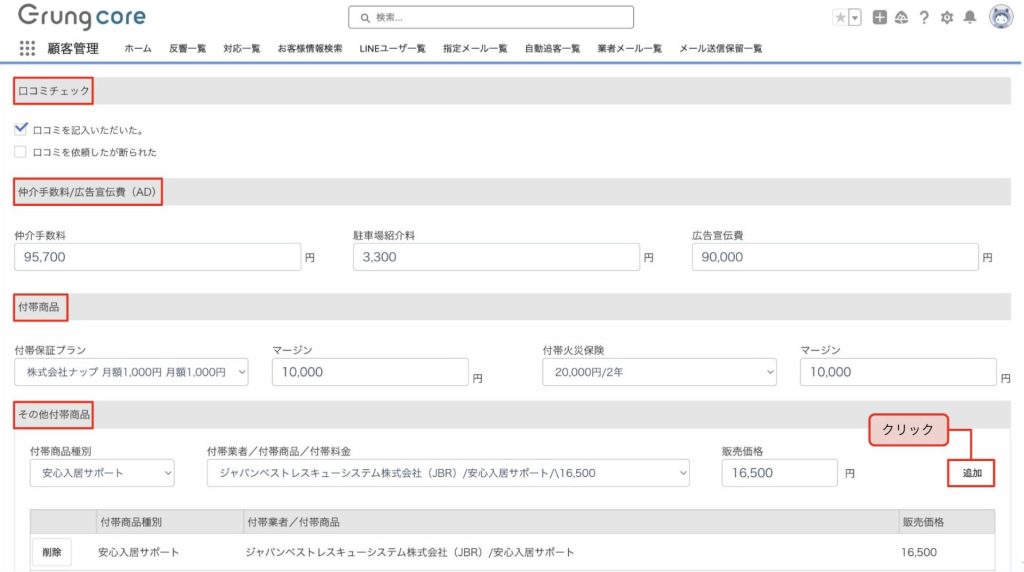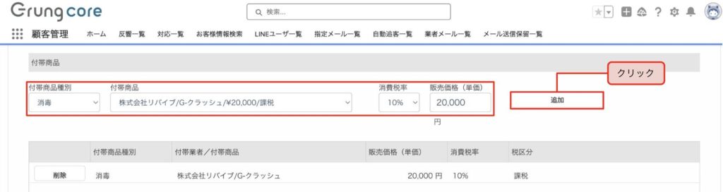 自社の付帯商品を仮見積もりに記載する場合、付帯商品種別などを選択して「追加」をクリックします。
