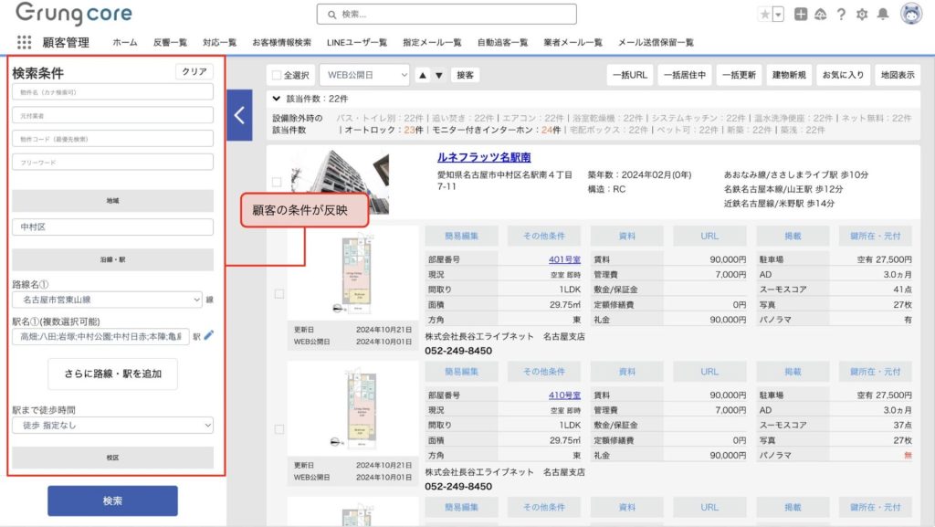 「検索条件」は変更可能です。変更した条件はお客様情報登録の条件を上書きしません。