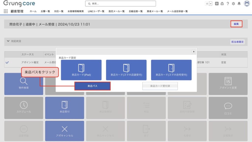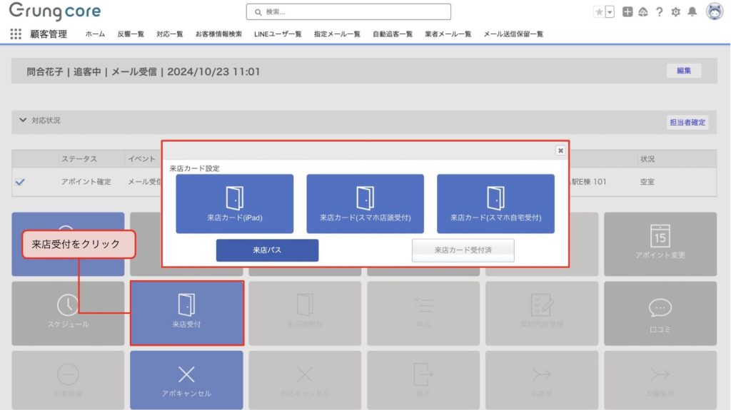 ※来店時は再度「来店受付」をクリックして、「来店カード受付済」を選択してください。