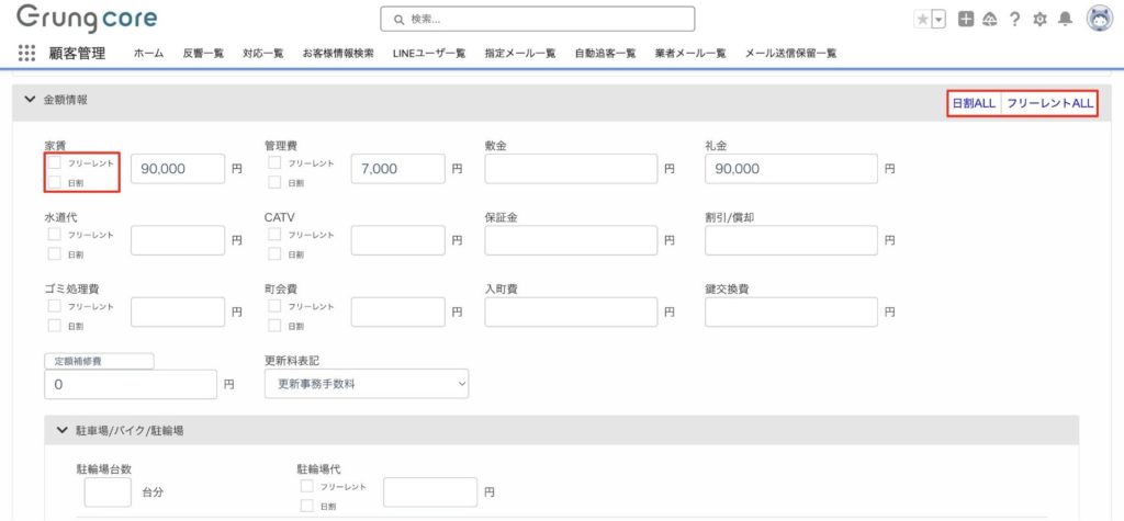 全ての項目に対して、日割りまたはフリーレントを適用する場合は「日割りALL」や「フリーレントALL」をクリック。