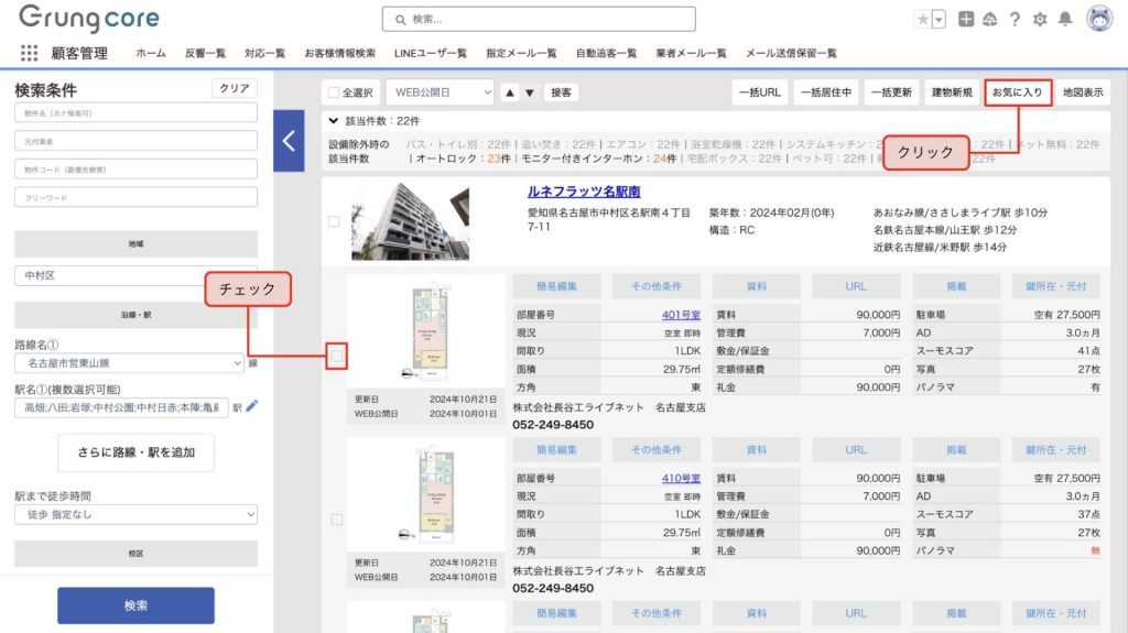 「お気に入り」ボタンをクリックすると、お客様情報詳細の「お気に入り物件」タブにチェックした物件が追加されます。