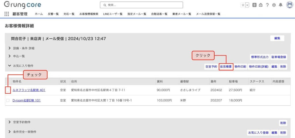 お客様情報詳細の「お気に入り物件タブ」に追加した物件にチェックを入れて「仮見積書」をクリックします。