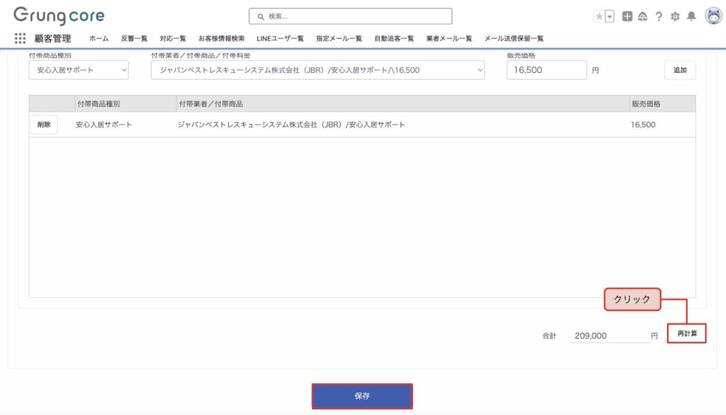 口コミ_売上修正を行う、お客様情報詳細を開き「申込」ボタンをクリックします。