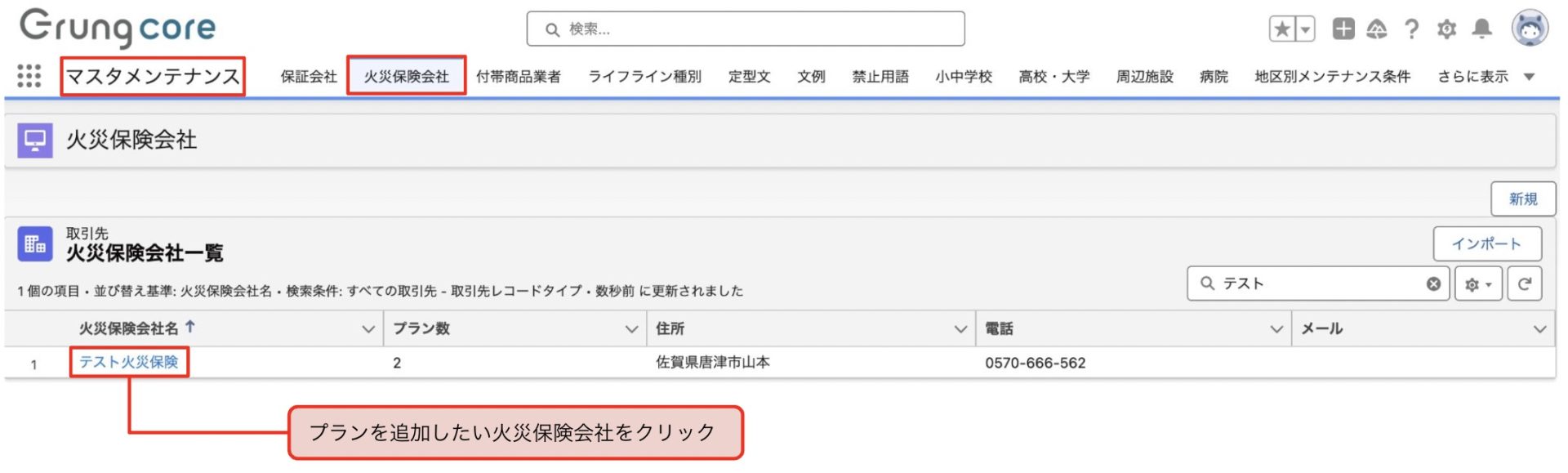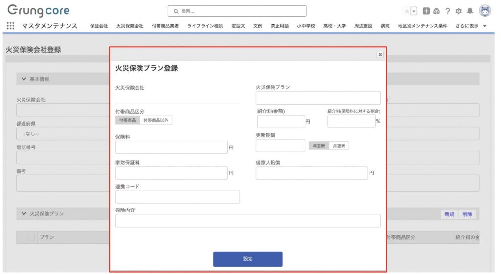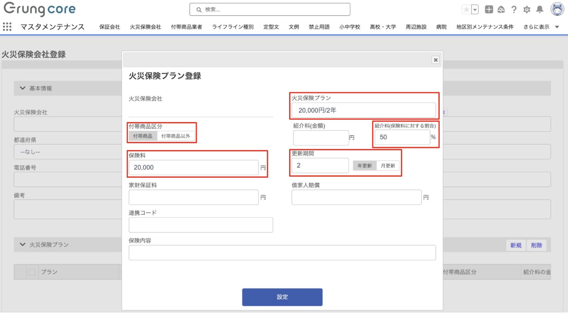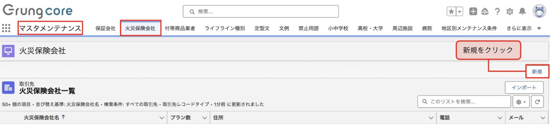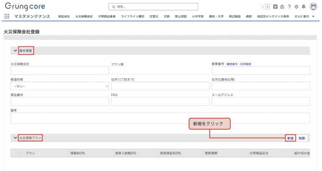 火災保険会社の基本情報を入力し、「新規」から火災保険プランを作成します。
