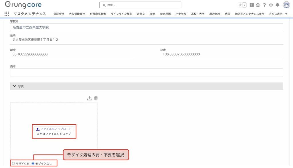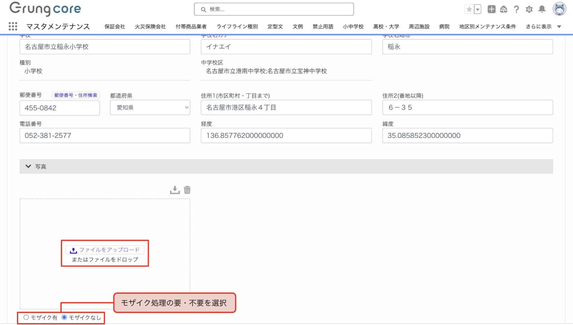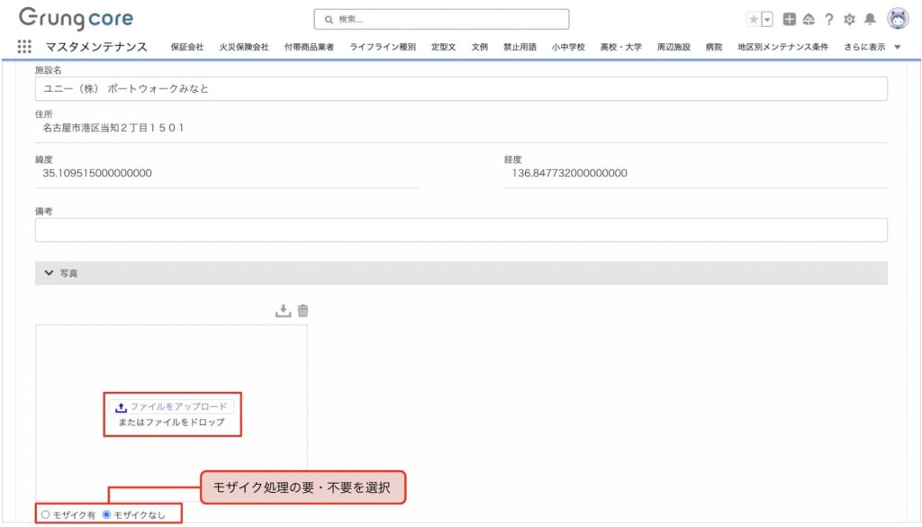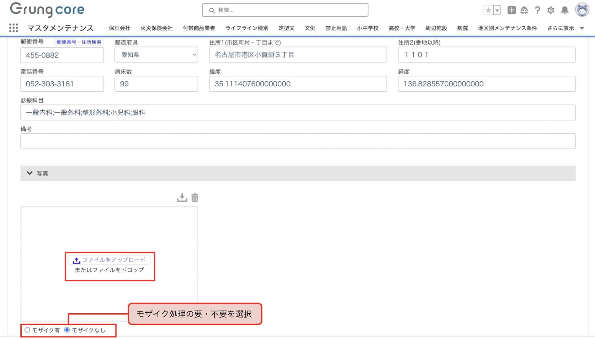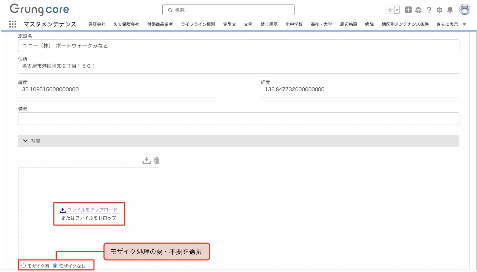 「モザイク有」を選択後に画像をアップロードした場合は、人の顔や車のナンバープレートにモザイク処理が施されます。