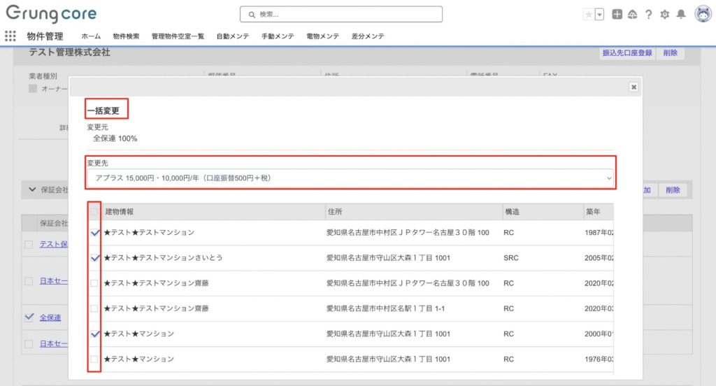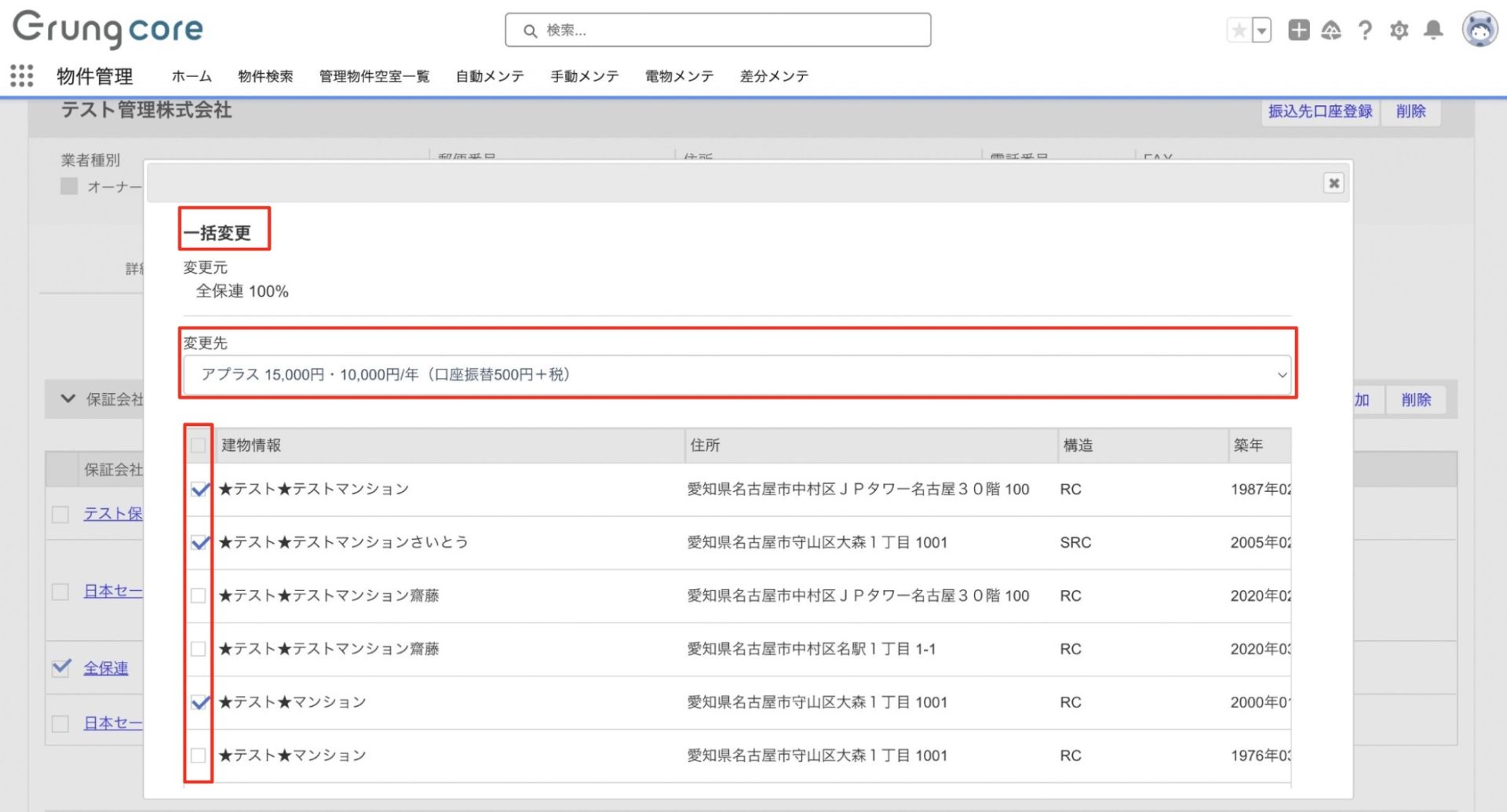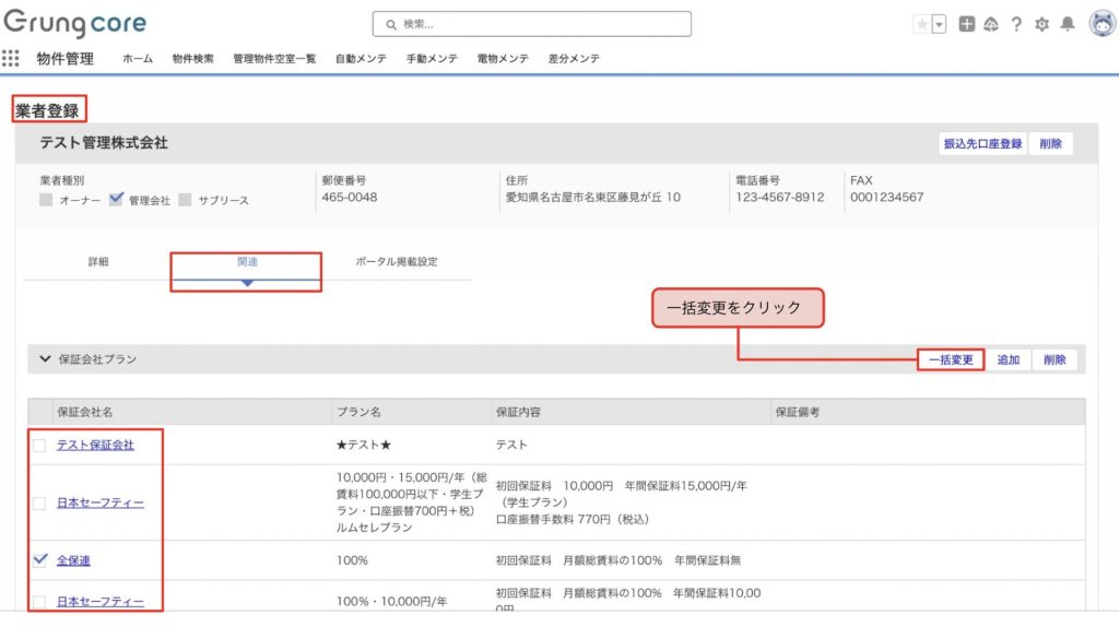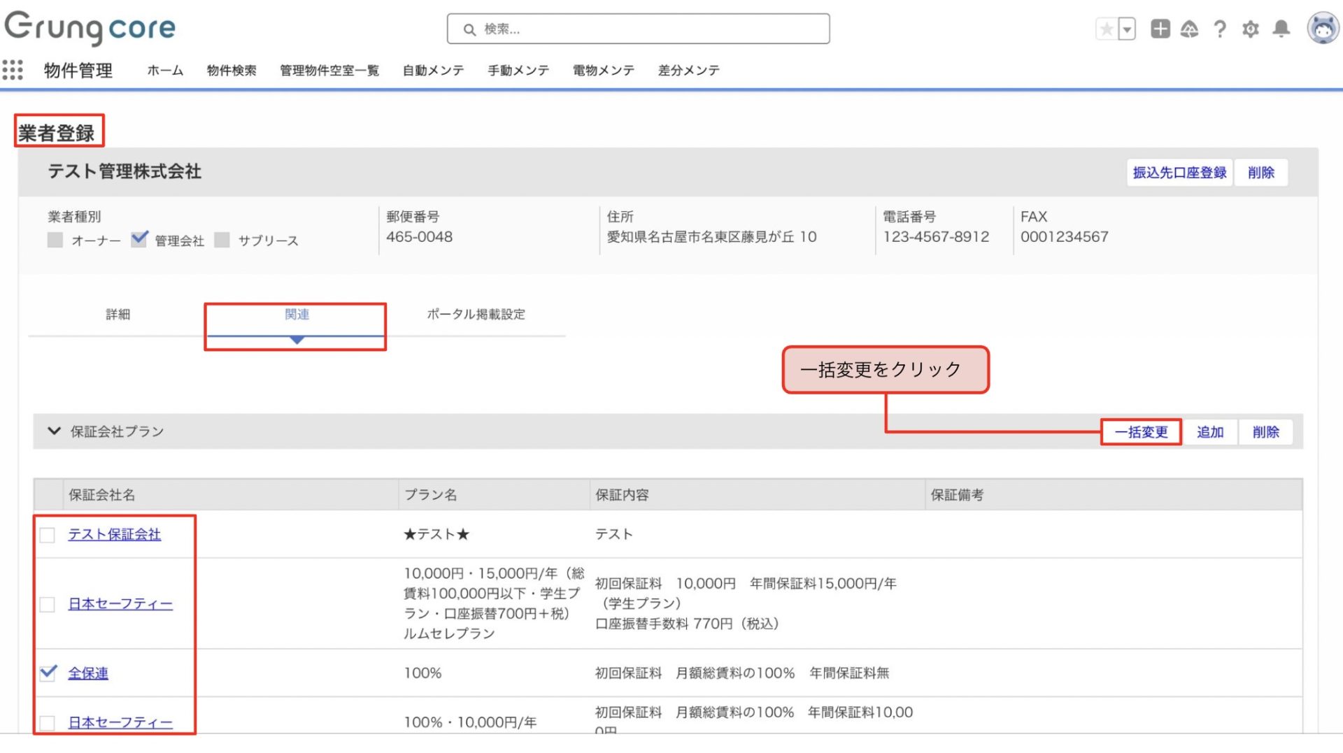 保証会社、火災保険、管理会社指定商品のプランを一括変更します。※保証会社プラン、火災保険会社プラン、管理会社指定商品の一括変更手順は同じです。 以下、保証会社プランで説明をします。 プランの一括変更の手順 業者登録の関連からプランを一括変更を行います。変更したいプランにチェックを入れて、「一括変更」をクリックします。 変更先を選択し、プラン変更の対象となる建物にチェックを入れて保存します。一括変更完了後はメールにて完了通知が届きます。 業者登録画面の保存をして完了です。