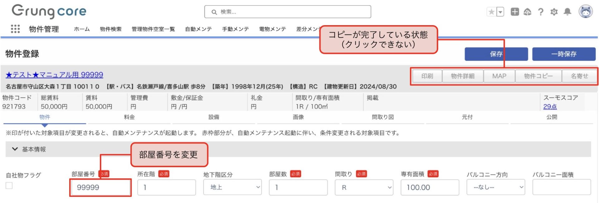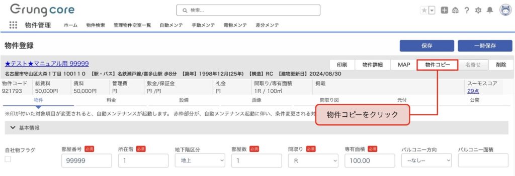 既存の物件情報をコピーし、新しい物件情報の作成を行います。 物件コピーの手順 物件登録画面からコピー物件を作成します。「物件コピー」をクリックします。※コピー元の物件に公開画像の登録がある場合は 「物件コピー」クリック後、写真コピーの要・不要を選択します。 部屋番号を変更し、一度保存をします。※保存を行うことで画像や間取りの登録が可能になります。 部屋番号の変更後、必要情報の修正・登録を行ってください。