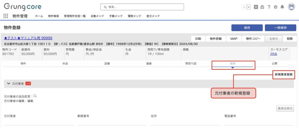 物件登録の元付タブから「新規業者登録」